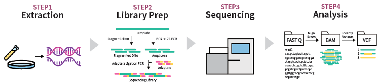 Fig. 3. NGS workflow four steps: sample extraction, library preparation, sequencing, and analysis