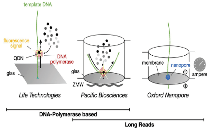 Representative technologies include Life Technologies’ Illumina sequencing, Pacific Biosciences (PacBio) single-molecule real-time (SMRT) sequencing, and Oxford Nanopore Technologies (ONT) nanopore sequencing.