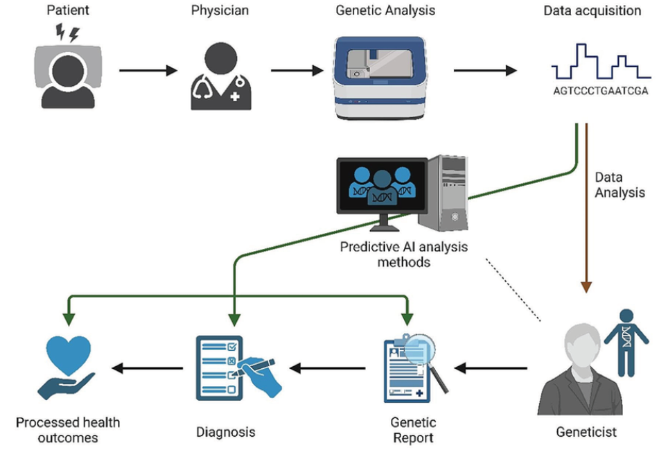 Against this background, artificial intelligence (AI) and machine learning (ML) technologies are emerging as key driving forces for the next wave of innovation in the field of molecular genetic testing. Fig. 6 illustrates the workflow of diagnostic genetic testing. By using AI algorithms to compare and analyze patient genomic data, the speed of diagnosis and treatment planning can be improved.