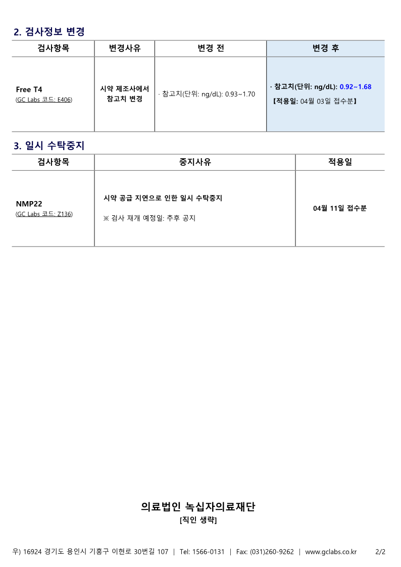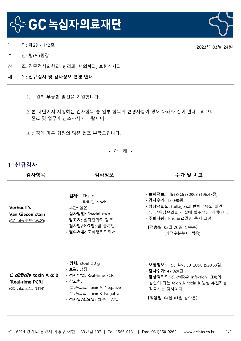 녹의 제23-142호(신규검사 및 검사정보 변경 안내)본 재단에서 시행하는 검사항목 중 일부 항목의 변경사항이 있어 다음과 같이 안내드리오니 진료 및 업무에 참조하시기 바랍니다.