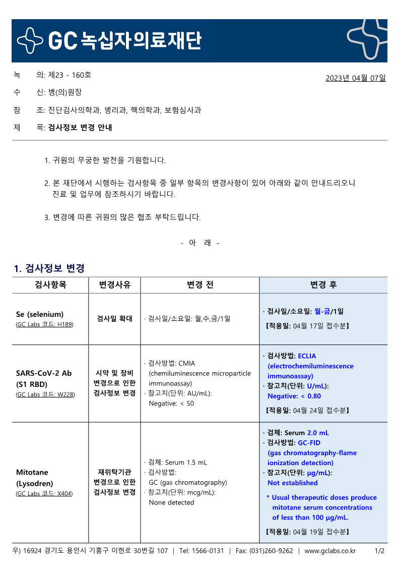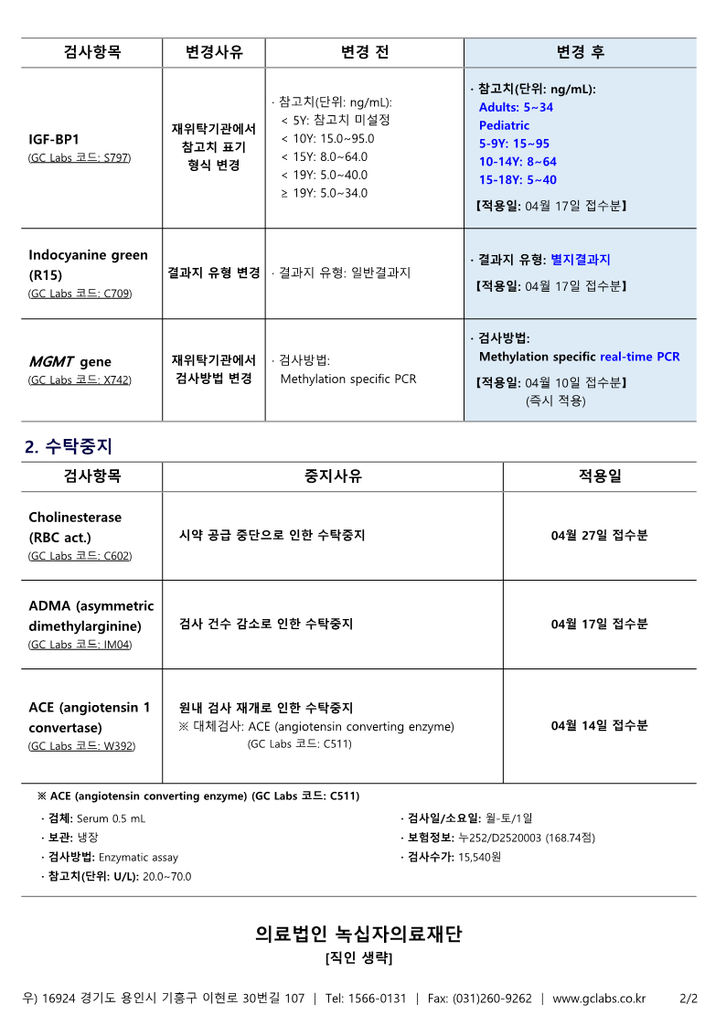 본 재단 검사항목 중 일부 항목의 변경사항이 있어 아래와 같이 안내드리오니 진료 및 업무에 참조하시기 바랍니다.