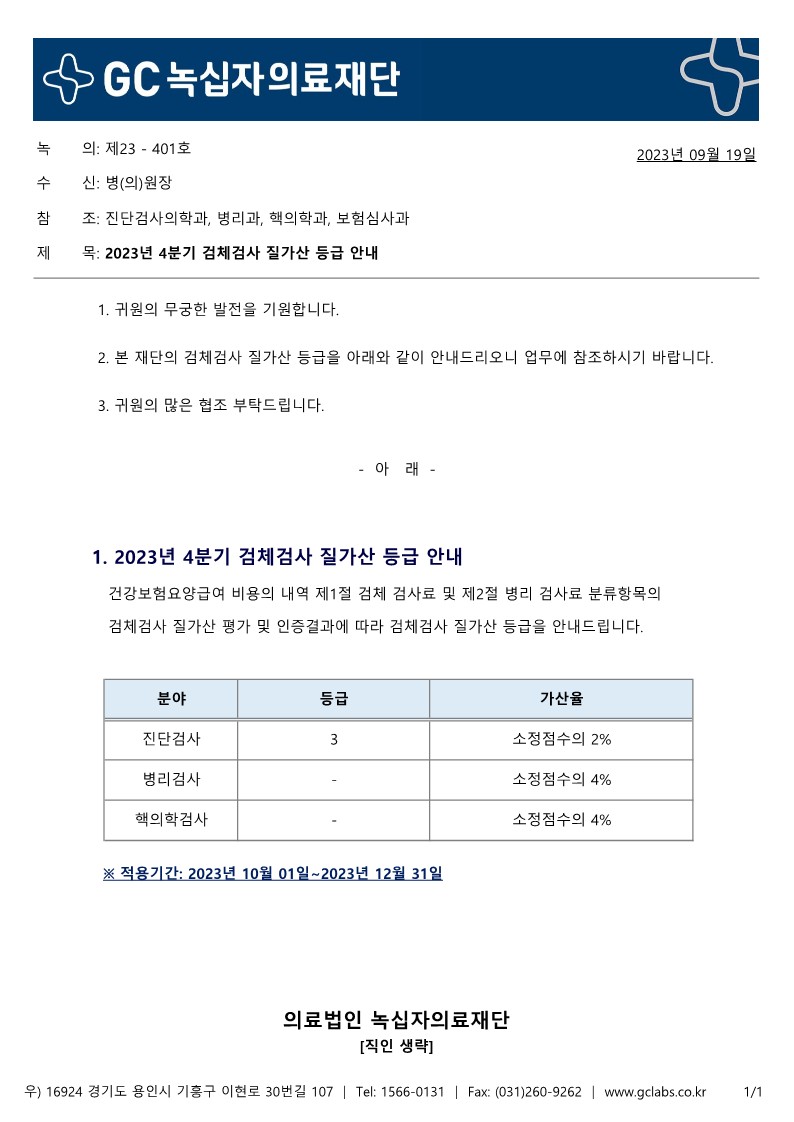 녹의 제23-401호(2023년 4분기 검체검사 질가산 등급 안내) 2023-09-19