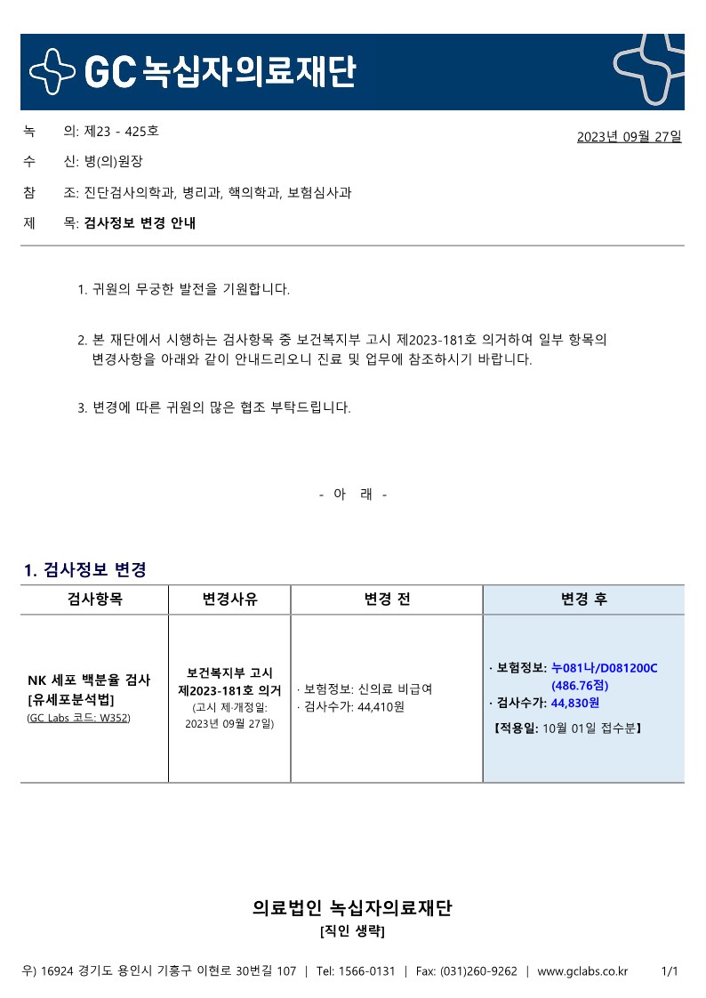 본 재단 검사항목 중 일부 항목의 변경사항이 있어 아래와 같이 안내드리오니 진료 및 업무에 참조하시기 바랍니다.