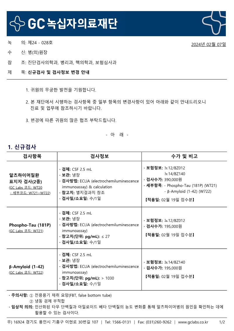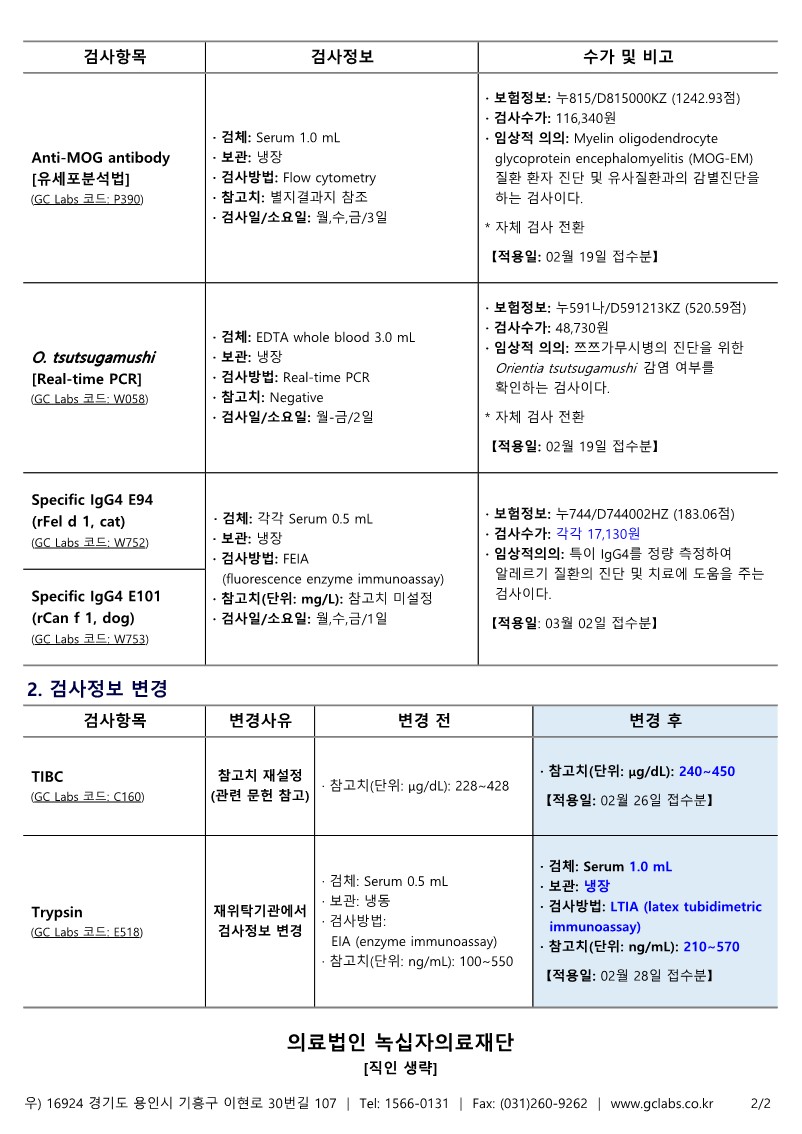 본 재단에서 시행하는 검사항목 중 일부 항목의 변경사항이 있어 다음과 같이 안내드리오니 진료 및 업무에 참조하시기 바랍니다.
