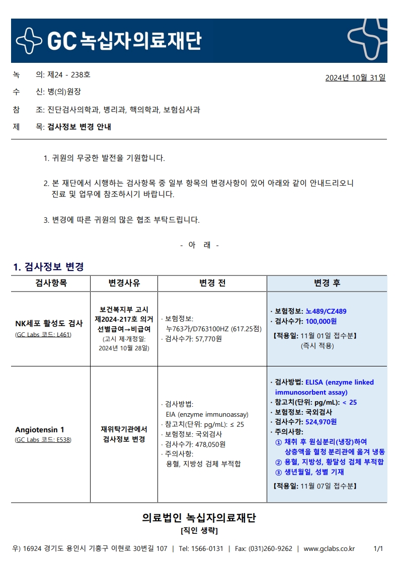 본 재단 검사항목 중 일부 항목의 변경사항이 있어 아래와 같이 안내드리오니 진료 및 업무에 참조하시기 바랍니다.