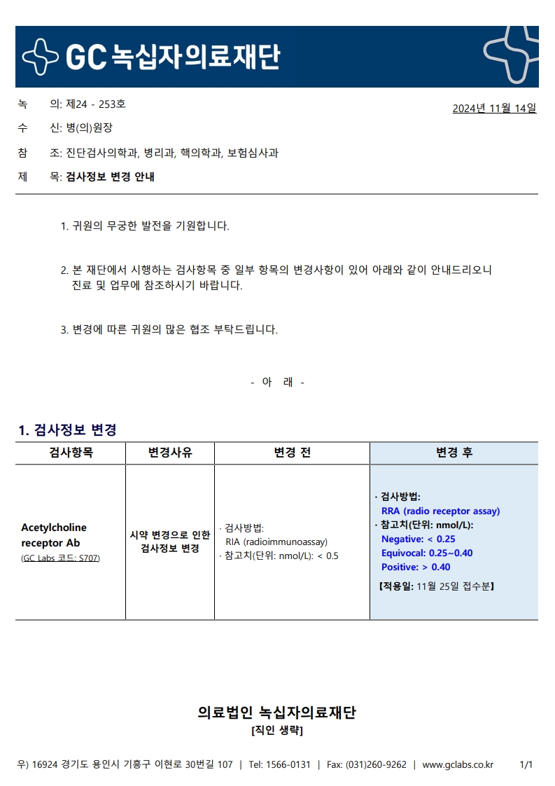 본 재단 검사항목 중 일부 항목의 변경사항이 있어 아래와 같이 안내드리오니 진료 및 업무에 참조하시기 바랍니다.