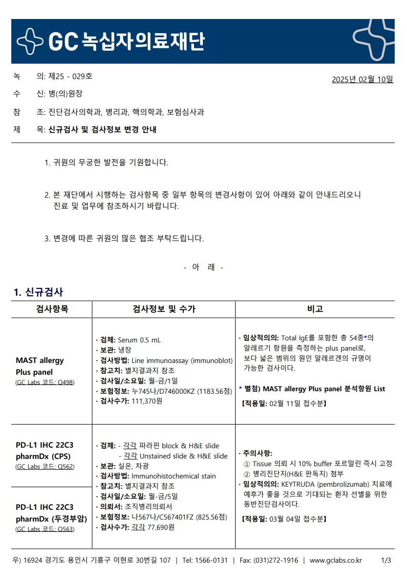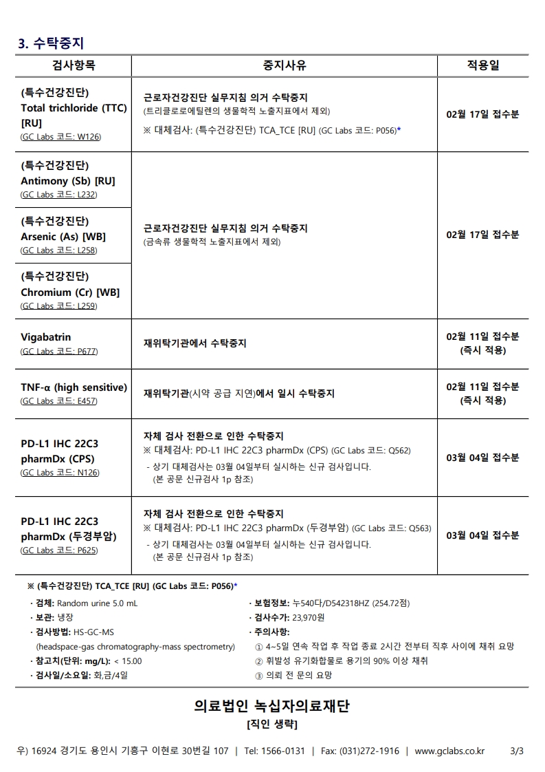 본 재단에서 시행하는 검사항목 중 일부 항목의 변경사항이 있어 다음과 같이 안내드리오니 진료 및 업무에 참조하시기 바랍니다.